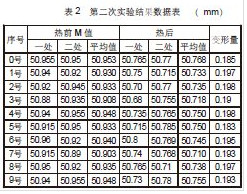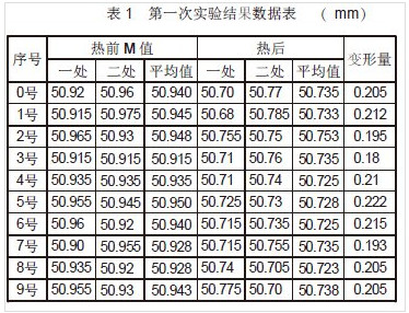 4)次实验跟踪件为10件,取热前加工后零件10件,分别编号为0号~9号,做好标记,并在装炉前依次测量其热前内花键M值,为了避免因测量随机性产生的误差,每个零件的内花键测量两处数值(做好标记防止热后混淆),取其平均值。其实验数据见:次实验结果数据见表1。