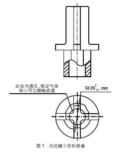 6)因此,决定改变工件入炉时的装卡方式,由以前的内化键朝上装卡,改为内化键朝下装卡,并在其有内花键处加上见图1所示的内化键变形补偿套用以减小内花键的变形,进而减小终止圆直径的变形。