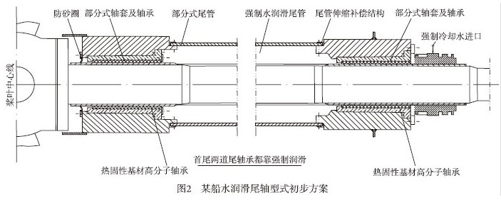 一般的采用水润滑推进型式的船舶,设计型式为:无尾管,尾轴包覆玻璃钢或其他防腐涂层,直接暴露在海水中旋转;设数道尾轴承,首道尾轴承采用强制水润滑,由冷却系统分一路冷却水供其使用,而对后面一道或二道轴承则采用自流水润滑,靠船舶行驶时与船舶相对的水流润滑冷却。