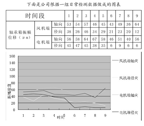 风机Z常见的故障就是轴承箱振动,可以通过外部检测进行初步诊断。轴承箱振动引起故障有迹可查,是一个振动由小变大,缓慢发生的过程。公司采用测振仪定期对风机的轴承箱进行振动值检测,对比振动值,迅速做出正确分析和处理,提前对有可能发生故障的风机进行有计划的检修,保证了风机的安全平稳运行。