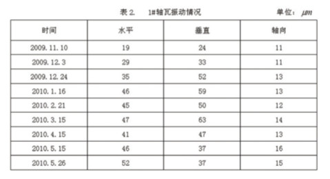 转子振动大是1#轴瓦损坏的重要因素,机组从2002年11月投产以来,转子的振动一直很大,这期间做过几次动平衡,有所改善,但经过一段时间运行后,1#轴瓦的振动就会增加,特别是在2009年10月以后,机组的振动更为明显,这期间的1#轴瓦振动记录如下表2所示: