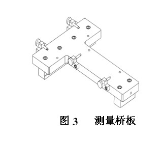 (2)垫板上各导轨安装面的精度是在机加工的时候依靠磨床本身的精度来保证的,磨床本身的误差也同步映射到垫板导轨的安装面上。加工后在磨床上进行测量也包含了磨床的误差,而且需要在机加工后放置一段时间,加工应力需要释放,此时垫板直线导轨安装面的精度会有所改变。针对这个情况,需要根据垫板的尺寸设计一套专用的工装来测量导轨安装面的精度,如图3所示。