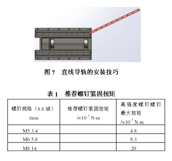(3)在垫板直线导轨安装面精度合格后,可以开始安装直线导轨。每副导轨都有主副导轨之分,每个生产厂家的主副导轨的标志是不一样的,在拆分前一定要认真阅读导轨的说明书,根据说明书上的标志先安装主导轨。导轨不可以直接放在导轨的安装面上,应该从导轨安装面一角开始慢慢地斜推进去,如图7所示。这样安装的好处是可以把导轨面上残余的垃圾推出去。放好导轨后,在不完全锁紧螺钉的情况下前后拉动直线导轨,以前后均可以轻轻地拉得动为宜,若拉不动则说明垫板上的螺孔与导轨上的孔距不符合。发生这种拉不动的情况时不能强行旋紧螺钉[2],要查出不符合的螺孔,否则会降低直线导轨的安装精度。在旋紧螺钉的时候,应该从中间向两端按顺序分两次用扭矩扳手拧紧。在次紧固时应按照规定力矩的一半拧紧,第二次需按照规定力矩进行拧紧,这样可以获得稳定的精度,见表1。然后以同样地方法安装另一根直线导轨。
