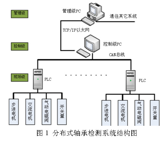 分布式轴承检测系统分为三级,如图1所示:级为现场级,考虑到现场设备的运行要有较高的稳定性,现场级采用可编程控制器PLC来控制生产线。在检测过程中实现上料、输送、夹装、分类等各个生产过程。第二级为控制级,一般采用激光干涉原理的传感器,其测量精度可达0.1μm。A/D数据采集卡一般安装在工控机的插槽中,系统通过测量轴承外径轮廓各点数值并对所测数据进行分析,然后将结果通知PLC,由PLC控制分拣出不合格产品;另一方面,该级工控机还需完成对现场的监测、控制、保护功能。系统通过现场总线CAN与现场级PLC实现通信。第三级为管理级,它接收控制级传来的各种实时数据或者历史数据,管理人员可观察系统的整个运行状态。该级的PC与控制级的IPC的连接采用复合TCP/IP协议的以太网。