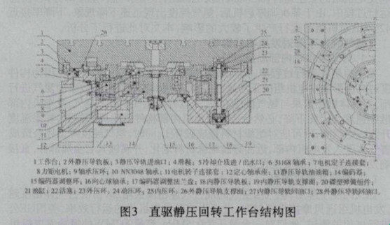 以下设计方案将静压导轨和直驱技术相结合。轴向采用静压导轨支撑,使工作台具有较高的轴向刚度和回转速度。直驱技术采用力矩电机,提高了转台的精度,改善了动态响应特性。其他相关的功能性结构略。