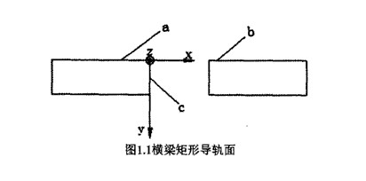 导轨的主要功能是导向,动导轨必须按照导向轨迹进行运动,因此必须限定除沿静导轨面移动的另外五个自由度。支承导轨制造或安装在立柱、横梁等支承件上,接触导轨面的宽度远小于其导轨的长度,根据定位原理,可以视导轨为窄定位板,只能限制沿y轴移动和绕x轴转动的两个自由度;可以利用两窄板(a和b)定位方法,在一个坐标面中形成一个定位平面,可以限制沿y轴的移动和绕X轴、Z轴转动的三个自由度;要准确导向,还需要限制沿X轴的移动和绕y轴的转动,因此,需增加另一坐标面上的窄支承平面c。从而形成Z基本的双矩形导轨。该矩形导轨结构简单,容易制造,刚度和承载能力大,安装调整方便。但是其缺点是导轨面易磨损且不能够自动补偿,且需要增加间隙调整机构。这种导轨广泛用于普通精度机床和中型机床中,如数控机床。为使C面定位可靠,保证导向精度,应用镶条调整c面与动导轨结合面之间的间隙。导轨面模型如图1.1所示。
