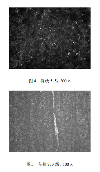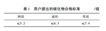 北满特钢生产热轧GCr15轴承钢采用的工艺路线为:电炉(转炉)冶炼+精炼→连铸一火轧制成材。按照GB/T18254-2002标准,供热压力加工状态使用的轧材不检验网状碳化物,因此在工艺中没有对网状碳化物的控制手段。而实际碳化物网状水平是5.5级,根据用户本次订货提出的检验碳化物要求,保证高温扩散退火时间大于5h,碳化物按SEP1520检验,合格标准如表1所示。