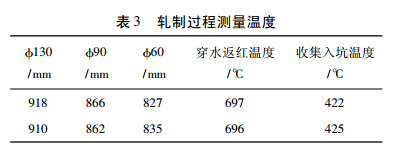 轧制后冷却过程中,过饱和碳化物沿奥氏体晶界析出,形成网状碳化物,通过控轧控冷方式使钢材快速冷却从而减轻网状碳化物的严重程度。钢材轧制过程为:245mm2→Ø130mm→Ø90mm→Ø60mm,轧制成材后钢材进行穿水快速冷却,通过调整轧制速度达到对轧制过程中钢材温降的控制,进而控制碳化物析出,降低网状碳化物级别,轧制过程中对钢材温度进行测量,测量结果见表3。