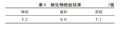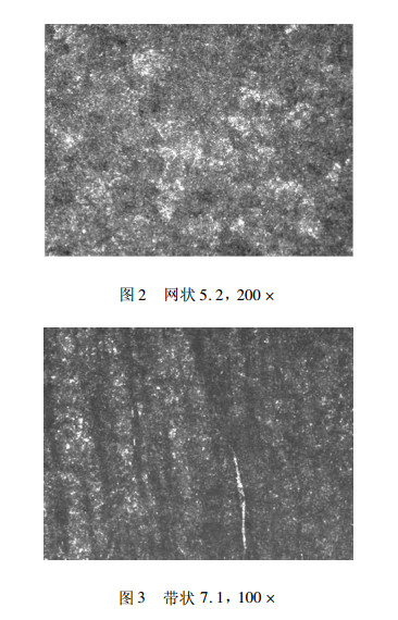 对钢材进行取样检验,碳化物检验结果如表4所示,网状、带状图片分别如图2、图3所示。由检验结果可以看出,碳化物网状为5.2级,液析为6.0级,带状为7.1级,比一火成材碳化物级别低,见图4、图5。表明Ø650mm连铸圆坯经两次高温扩散后完全消除了液析,并有效控制了带状碳化物。穿水后快速降至700℃以下后,空冷至400℃左右可有效控制网状的形成。