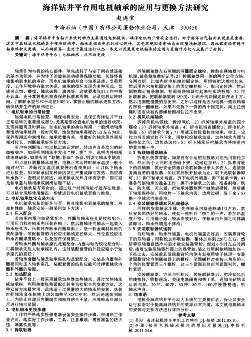 海洋钻井平台用电机轴承的应用与更换方法研究