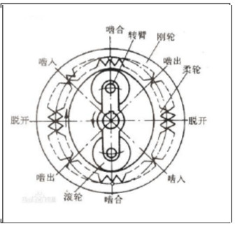 如以刚轮固定不变,以波发生器为主动件,柔轮为从动件。波发生器的一对滚子将柔轮撑成椭圆形。在长轴方向,柔轮上的外轮齿与刚轮上的内轮齿完全啮合,此时在短轴方向柔轮完全脱开,中间区域为过渡状态。