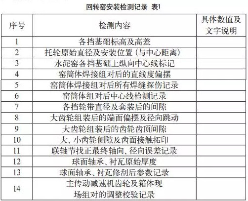 设备进厂后,水泥企业应对关键资料实行认真细致的查验。具体包括制造厂家的出厂检验证明文件,关键部件,并对这些资料备份保存于技术资料室。然后应选定技术雄厚、管理到位、具一定业绩的安装公司严格按行业标准进行施工安装。对于设备在正式安装期间,企业更应安排专业的技术管理人员负责施工现场的技术监管。担任此任务的技术管理人员应具备较高的技术素质和技术把握能力,并且要求了解掌握当前水泥行业先进技术标准、精度要求,特别强调的是安装过程中重要数据的记录与保存。认真填写如表1所示的内容。