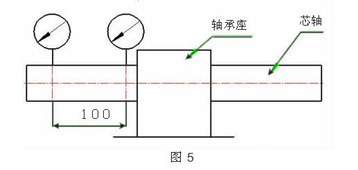 轴承支承座的装配之前的检查,当确定某两个轴承座为一组时,首先用专用研检具对轴承座进行检查其止口端面对孔的垂直度,不良时研刮解决,接触率75%且均匀。用芯轴检查单个轴承座的等高度(芯轴要求等径)图五,在轴承座端面根部及距端面100mm处,均不得超过0.005mm,可采用研刮、磨削等方法加工至要求。