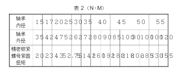 丝杠轴承定向装配,轴承内外圈侧面(或倒角)一般都标有径向跳动Z大点的标识“0”,安装轴承时该标识“0”点应对准丝杠轴径径向跳动Z低点;轴承安装时必须使用专用工具,配合表面涂上清洁的机油,未预紧状态下不允许转动轴承。常用滚珠丝杠专用角接触球轴承螺母紧固力矩见表2(N.M)。