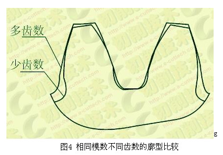 切入式修整法对金刚滚轮的制造要求较高,尤其在磨削少齿数工件时。一方面,齿数越少,齿根圆越小,修整砂轮时滚轮的R圆弧的接触区域大,对滚轮制造要求也越高;另一方面,工件齿数少,渐开线曲率半径小,齿廓弯曲程度高,对径向误差敏感,这对滚轮自身径向跳动误差及安装后动态径向跳动误差提出了更高的要求。相同模数、不同齿数的廓型比较见图4。