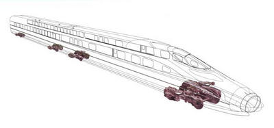 高速动车组转向架分为动力转向架和非动力转向架两种类型,两种转向架采用基本一致的结构型式,但非动力转向架没有牵引电机和驱动装置。每台动力转向架有两根动力轴,牵引电机采用架悬方式。转向架构架为H型箱形焊接结构,由侧梁、横梁及枕梁组成;一系悬挂是螺旋弹簧加垂向减振器;二系悬挂为带有辅助橡胶堆的空气弹簧直接支撑车体。动力转向架采用轮盘制动,非动力转向架采用轴盘制动。