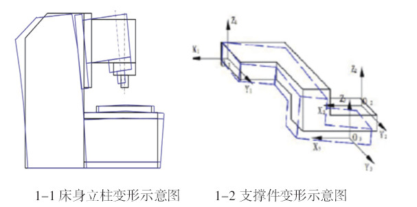 如图所示1-2,机床支撑件受力变形。支撑件上坐标系O2(X2,Y2,Z2)相对于坐标系O1(X1,Y1,Z1)的齐次变换矩阵为: