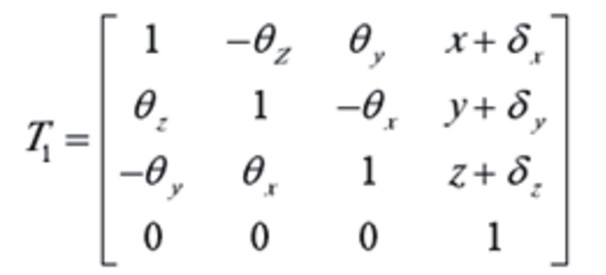 当支撑件受到复杂的力或力矩时存在平移误差δX、δY、δZ和转角误差θX,θy,θZ时,由齐次坐标变换矩阵的原理,经过坐标系的平移变换和旋转变换,得到齐次变换矩阵为: