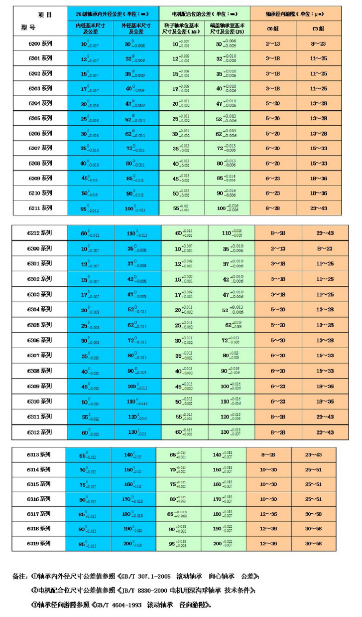 P6级轴承内外径及电机轴和轴承室的配合公差表
