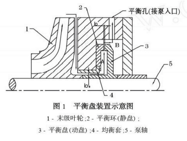 (2)平衡盘轴向间隙b过大,平衡盘作用减弱。经测量该间隙达0.52mm(一般取0.1~0.2mm,运行状态时保持在0.02~0.05mm),平衡盘的平衡作用减小,剩余较大的轴向力由止推轴承承担,Z终导致止推轴承损坏,平衡盘磨损,较大的轴向窜动也导致机械泄漏。