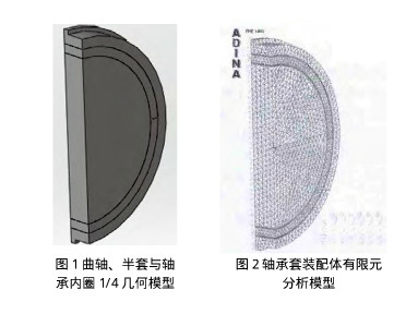 为了简化分析模型,采用曲轴某一段曲拐及相应的半套和轴承内圈作为研究对象,并且采用1/4分析模型。曲轴曲柄、半套和轴承内圈组成的装配体三维模型如图1所示。