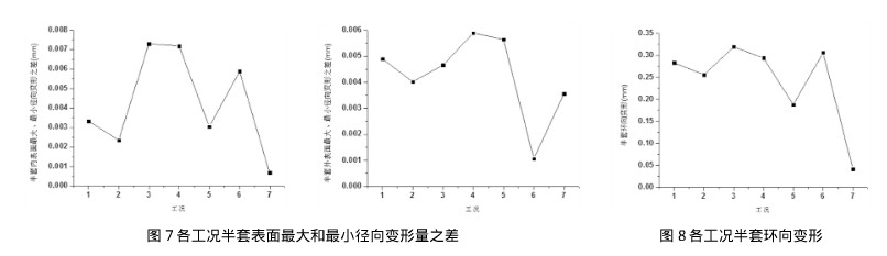 (2)半套在2mm缝隙处径向变形量大于顶部,半套径向不是均匀变形,过盈量不足时可能导致半套表面无法完全贴合;可以看出工况7中曲轴、半套和轴承表面完全贴合,单从径向变形均匀度角度分析是较优的选择。