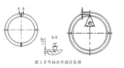 早期的关节轴承(GE…DS型),外圈带有装配槽,内圈磨有一条环形带,易于拆卸、互换,使用一段时间可更换磨损件,延长轴承的使用。但这种结构类型的产品,也由于其有装配槽,环形带不利于产品的加工和发挥产品性能。随着产品的更新换代,GE…DS型已是淘汰型的产品,已被单缝向心关节轴承GE…ES或剖分型向心关节轴承GE…XS取代。GE…ES型关节轴承的特点是外圈有一条裂缝,内圈靠挤压装入外圈。GE…XS是剖分型关节轴承,其特点是将外圈剖分对等两半,再与内圈进行配套。这两种类型产品是关节轴承Z主要类型,它们都属于开缝型的关节轴承产品。它们共同的特点:在外圈端面或内倒角上加工有引裂槽(如图1所示),作为引裂源,在配套前,利用冲床或油压机将外圈引裂开来,再进行装配合套。