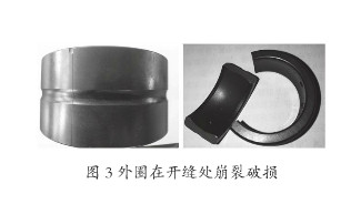 开缝型关节轴承产品,材质一般选用Gcr15或Gcr15SiMn轴承钢,在外圈端面或内倒角上加工有一条或一对引裂槽,如图2所示。外圈引裂纹一般采用冲床或油压机给外圈施加压力,引裂槽槽底尖角处产生应力集中效应,使槽底尖端的裂纹扩展,沿轴承外圈形成轴向贯穿裂缝,一条或对边裂开这一过程称为“引裂”。由于材料引裂过程受很多因素影响,常出现引裂不良,直接影响到后面产品装配。根据长期生产加工经验,引裂不良会影响到产品的外观质量,造成配套崩裂,直至报废,是关节轴承加工中产生废品,主要报废损失之一。因此,研究解决开缝式关节轴承引裂不良,装配破损,对提高关节轴承加工的经济效益和使用性能,具有重大的意义。根据公司几十关节轴承生产经验,关节轴承在引裂装配工序,出现引裂不良,破损主要:引裂不开、引裂缝歪斜、不直,引裂面不平整装配合套时出现崩裂,单缝外圈却一分为二,甚至崩裂成多块碎片,引裂缝上崩掉一小块,引裂缝出现毛边等,如图3所示。