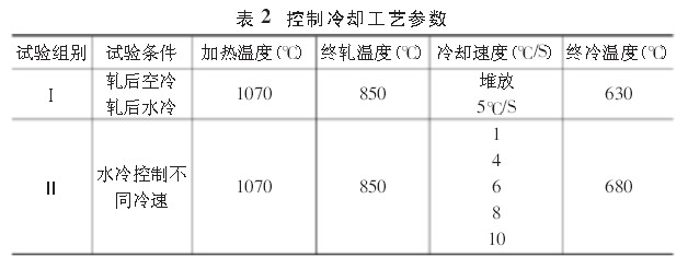 钢坯在步进式加热炉中加热,出炉后在连轧机上进行轧制,整条轧制线由粗轧、中轧、精轧三部分,轧制参数全部由PLC系统自动调整,通过对轧制线上三个水冷段冷却水的流量和水压调节控制,来实现对冷却速度的控制,粗轧、中轧和精轧段、精轧第二阶段的平均变形量分别为:33%、30%、23%,其它工艺参照相应规定执行,具体控制冷却参数如表2所示。