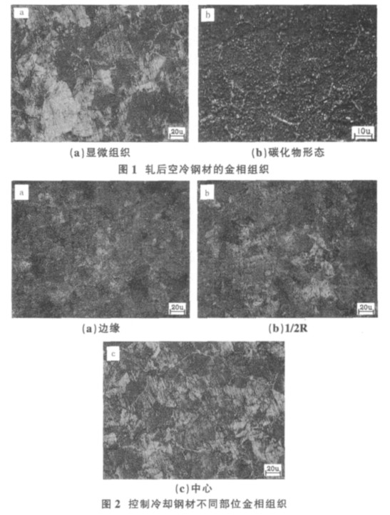 由上图对比可见,钢材轧后空冷的组织为粗片状珠光体和较厚的网状碳化物,而控制冷却钢材边部和R/2处组织为索氏体和球状碳化物,心部组织为珠光体、索氏体、少量球状碳化物。轧后控制冷却的钢材组织中,有球状碳化物形成,这是由于轧后控制冷却,加快了冷却速度。一方面能降低奥氏体向珠光体的转变温度,同时又能加快相变时的冷却速度,使形成的珠光体片层间距变薄;另一方面过冷度大,过冷奥氏体在冷却过程中没有先共析渗碳体析出,原来不是共析成分的钢材,其组织全部变成珠光体,形成并非共析成分的伪珠光体组织。