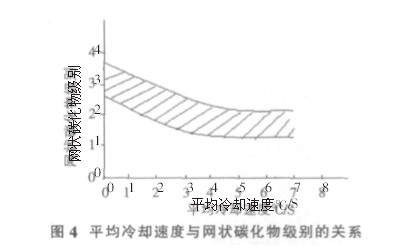 4.2轧后不同冷却速度对网状碳化物的影响棒材轧后按照不同的冷却速度进行冷却,在碳化物析出温度范围内采用不同冷却速度得到的网状碳化物组织如图3a,b,c所示;平均冷却速度与网状碳化物级别的关系如图4所示。