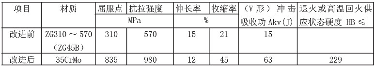 在设备投入使用的前几年里,多次发生大、小圆锥齿轮断齿事故,经解体认真检查,并分析原因,发现大圆锥齿轮材质过脆,韧性低。同备件供应商共同探讨,改进大圆锥齿轮材质,齿轮经调质热处理后,不进行齿面淬火处理,这样即保证了齿轮的强度,又增加了韧性。两者的机械性能对比见表1。