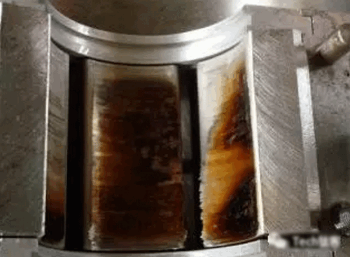 2008年6月,辽阳石化机械检修部在中原乙烯化工厂乙烯车间检修某压缩机机组,在解体增速器时发现高速轴径向轴瓦烧毁严重(如图B),经分析和验证轴瓦损坏的原因是轴承间隙调整过小而造成的高温烧毁。