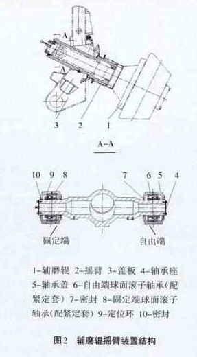 辅辊摇臂主要由摇臂、轴承座、轴承盖、球面滚子轴承、定位环和密封圈等部分组成(见图2)。