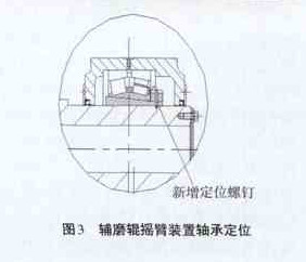 但在实际生产中,由于冲击和振动,辅辊摇臂轴承紧定套会出现松动,从而有窜轴的可能。对此问题,现场一般会用锤击扳手将锁紧螺母拧紧,并增加定位销钉(见图3)。这种方法存在一些弊端,主要是锤击扳手冲击力的大小不能准确掌握。如果冲击力过大,紧定套上的螺母拧的过紧,安装游隙减小,运转时温度升高会使轴承抱死;冲击力过大还会将轴承内圈胀裂,造成轴承损坏。当冲击力小时,紧定套上的螺母没有按规定的拧紧力矩拧紧,经过一段运转后会切断定位销钉,还会出现窜轴现象。