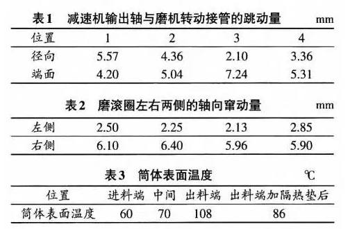 拆开双滑履水泥磨的轴瓦罩子,检查了减速机输出轴与磨机转动接管的跳动量,采用不拆平衡轴,做假轴同步打表方式测。共测三次,三次结果基本相同,见表1。由表1可知,磨机传动接管比减速机端低1.7mm。用2块表分别测量磨滚圈左右两侧的轴向窜动量,结果见表2,磨体窜动量为0.5mm。磨机顶面标高差结果为磨头比磨尾高0.5mm。以前测量的简体表面温度,没有测量滚圈表面温度,此次测量结果见表3。