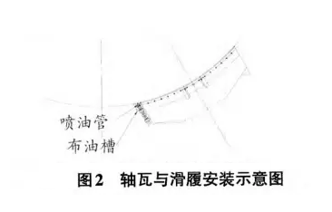 (1)改善润滑。轴瓦与滑履安装示意图见图2。布油槽内增加喷油管,以便油能更好的粘到滑履表面和润滑油有效地进入瓦口,从而确保形成油膜。