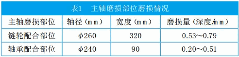 山东东华水泥有限公司5000t/d水泥熟料生产线采用YDQ1600/500/90型堆取料机完成石灰石的堆取料工作,其中取料能力500t/h。该设备驱动链轮与主轴之间采用过盈以及平键配合联结型式。在运行过程中,由于石灰石料堆变化导致运行负载超过额定载荷,长期的超载运行造成键槽与键、轴与链轮孔配合间隙超标,继而引起轴径的永久性变形和链轮组轴承安装以及链轮配合部位的磨损。磨损详细情况见表1。