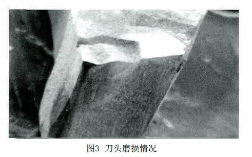 由于修复材料中含有陶瓷颗粒,对车削的刀头来说犹如砂轮,因此车削过程中刀头磨损非常快。经过现场观察分析,每车削轴向20~50mm时,刀刃就已成平面状,刀头磨损情况见图3,此时应及时更换刀头或对刀头进行磨销处理,但由于现场没有及时处理致使车削出的部位呈锥型。车床操作人员为避免出现锥度,利用增加进刀量来补偿刀头的磨损量,但刀头已经完全没有了刀刃,使加工过程中的车削力变成钝面刀头的下压力,造成了对修复材料的挤压破坏。