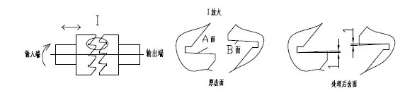根据回转窑的使用要求,回转窑的辅助减速机与主减速机之间需要快速的手动结合及分离,为此,两者之间用斜齿离合器连接,以方便两者之间快速的结合及分离。回转窑投入使用3年后,发现辅传转窑时斜齿离合器会慢慢自行分离直至脱开,脱开后需要再次手动合上离合器,使用不便。检查发现,离合器接触面A面、B面磨损后分别向逆运转方向、运转方向稍微倾斜(图1),运转时A面将力传递到B面,B面对A面的反作用力存在朝向输入端方向的轴向分力,输入端半离合器在轴向分力的作用下逐渐向输入端方向移动,直至离合器脱开。处理办法:现场用THJ507焊条将离合器的A面及B面焊接并修磨成图1中的齿面,这样处理后离合器使用效果很好,不再自行脱开。