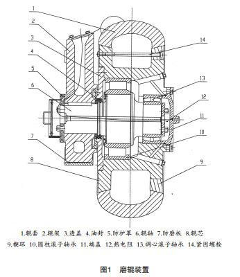 磨辊装置是辊式磨煤机的碾磨装置(见图1)。主要由辊架、辊轴、辊套、辊芯、轴承、油封等组成。物料在磨辊与磨盘之间在液压加载力作用下被碾磨成粉,因此,磨辊装置是辊式磨煤机的关键部件之一。