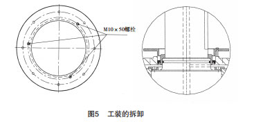 (6)拆去M12×120螺栓,将3件M10×50螺栓组到工装法兰上,通过拧紧螺栓M10×50,取出工装法兰并拆去螺栓M10×50,见图5。