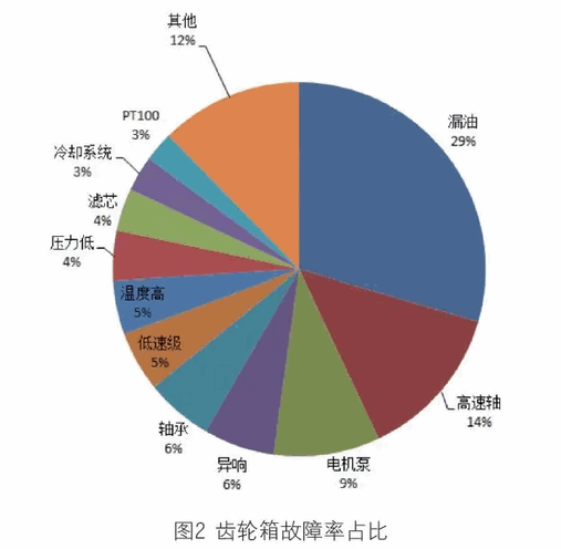需停机处理的故障主要集中在管路漏油、高速轴、电动泵、油温油压报警、滤芯、冷却系统、轴承及异响。这些故障会直接造成齿轮、轴承润滑不良,若不及时处理会引起齿轮和轴承出现缺陷并扩展,甚至会导致下架。通过几年统计分析,表现出的主要故障分布情况如图2所示。