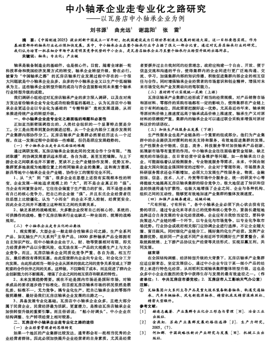 中小轴承企业走专业化之路研究——以瓦房店中小轴承企业为例