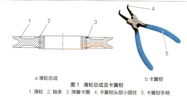 工程机械的滑轮总成由滑轮、轴承、弹簧卡圈等组成,如图1a所示。轴承镶嵌于滑轮内孔中,弹簧卡圈安装在轴承外圈两侧的凹槽内,其中弹簧卡圈为弹簧钢制成,其作用是防止轴承从滑轮1上脱落。弹簧卡圈为开口圆环,其开口两端各有一个小圆孔,用于安装时撑开弹簧卡圈。