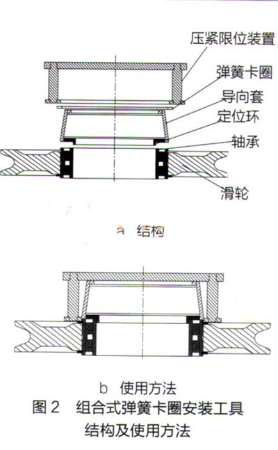 采用组合式专用工具安装弹簧卡圈,克服了使用卡簧钳时弹簧卡圈存在的安全隐患,能保证弹簧卡圈不被损坏,既减轻了工人的劳动强度,又提高了作业效率。目前,该组合式专用工具已被广泛应用于我公司大吨位起重机滑轮轴承装配作业,获得了良好的经济效益。