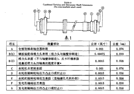 1.2.1水轮机轴和发电机轴组合。当在工厂内进行水轮机和发电机轴组合找正时,可在车床上旋转检查或在垂直校准平台上进行。水轮机和发电机组合轴解体前应做好对应标记。通过固定在车床或工作台上的检测装置所读取的摆度(跳动)值不应超过表1的规定。
