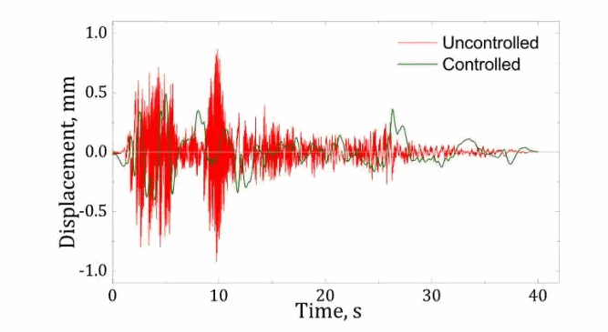 纯框架(未受控)与包含基座隔振系统框架(受控)响应的对比,图片由R.Sugumar、C.S.Kumar和T.K.Datta。