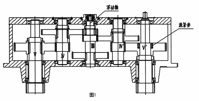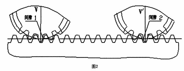 如图一、图二、首先,把紧固Ⅴ’轴上齿轮的涨紧套松开,同时把Ⅲ轴提升到啮合间隙Z大的位置,旋转Ⅱ轴,逆时针用力扳住使其不会改变方向,通过齿轮传动,Ⅴ轴获得顺时针的旋转力,使齿轮轴的齿面与齿条的一个齿面啮合消除间隙1,然后,用力逆时针旋转Ⅴ’轴,与Ⅴ轴获得相反方向的旋转力,使齿轮轴的齿面与齿条的另一个齿面啮合消除间隙2。与此同时让Ⅴ’轴齿轮上涨套松开的斜齿轮顺时针旋转,消除此轮之前传动链上的间隙。这时,紧固Ⅴ’轴上斜齿轮内的涨套螺钉,把Ⅲ轴放松任其自由落下与Ⅳ轴、Ⅳ’轴斜齿轮间隙消除,背紧Ⅲ轴上的背帽即可。
