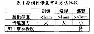 经测量该轴轴径磨损深度1mm,磨损长度265mm。刷镀、堆焊和镶套是修复磨损件常用的有效方法,在选择修复工艺时,首先对几种方法进行比较,对比见表1。